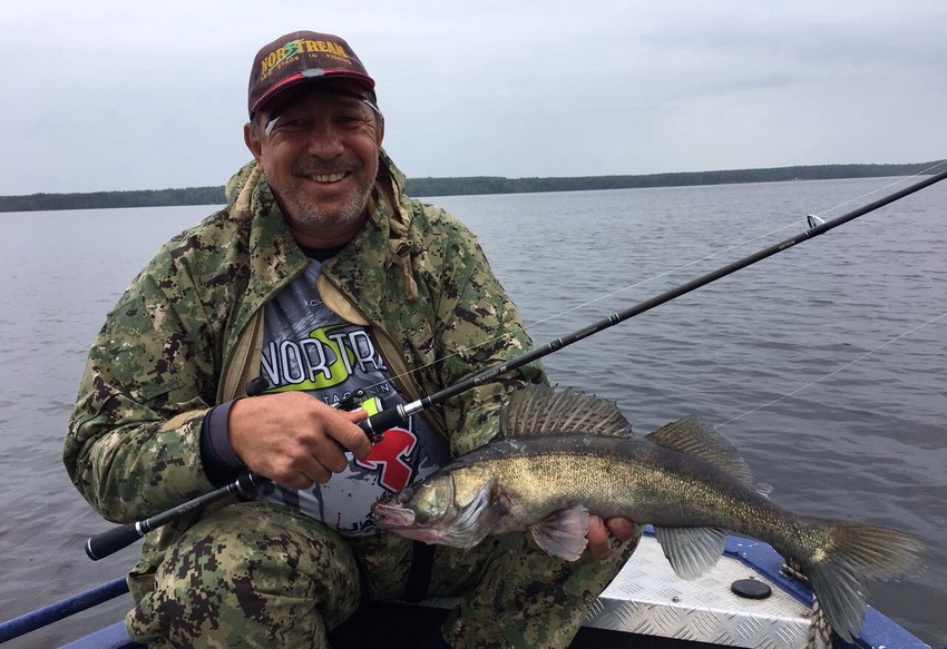 В прибрежной зоне нам встречались скопления некрупного окуня. Решив испытать «Динамик» на джиге, я взял у Василия семьсот шестьдесят вторую унцовку, кончик которой живее, чем кончик более короткой модели. Когда я облавливал один довольно крутой свал, вершинка удилища вдруг согнулась от яростной атаки судака, но мощное удилище не оставило этой зачетной рыбе ни единого шанса.