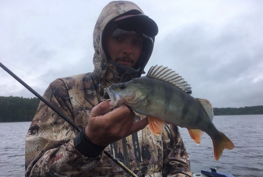 Утром следующего дня разразился апокалипсис. Дождь лил, как из ведра, но, невзирая на непогоду, все экипажи устремились на поиски уловистых мест. В этот короткий тренировочный день мы поменялись участками: экипаж Кривцов — Чепуштанов ушел в нижнюю часть Десногорки, а наша «Волжанка Legend Fish 46» устремилась к верховьям. После первой тренировки мы решили не делиться точками, где были поклевки, и не проверять их, а заниматься поиском новых мест, стараясь наработать как можно больше активных точек для дней соревнований. Рельеф в окрестностях устья Соложи оказался привлекательным: здесь встречались и коряжки, и столы на глубине 7–8 метров, и поперечные провалы между ними, но у нас с этим местом не складывалось второй день. По пути к «Свиному рылу» вершинки наших спиннингов стали сигнализировать уверенные поклевки, но количество их нас не удовлетворяло. Честно говоря, нам казалось, что плотность хищной рыбы в водоеме низкая, ярко выраженных мест скопления хищника нам не попадалось, а редкие поклевки были размазаны по обширным площадям. К середине тренировки в одном ничем не примечательном месте на глубине шесть метров сканер прорисовал локальное скопление окуня. С первых же забросов полосатая рыба стала проявлять себя практически на каждой проводке четкими поклевками, но с подсечкой были проблемы. Пойманная рыба была крупнее прибрежной мелочевки и явно зачетного размера.
