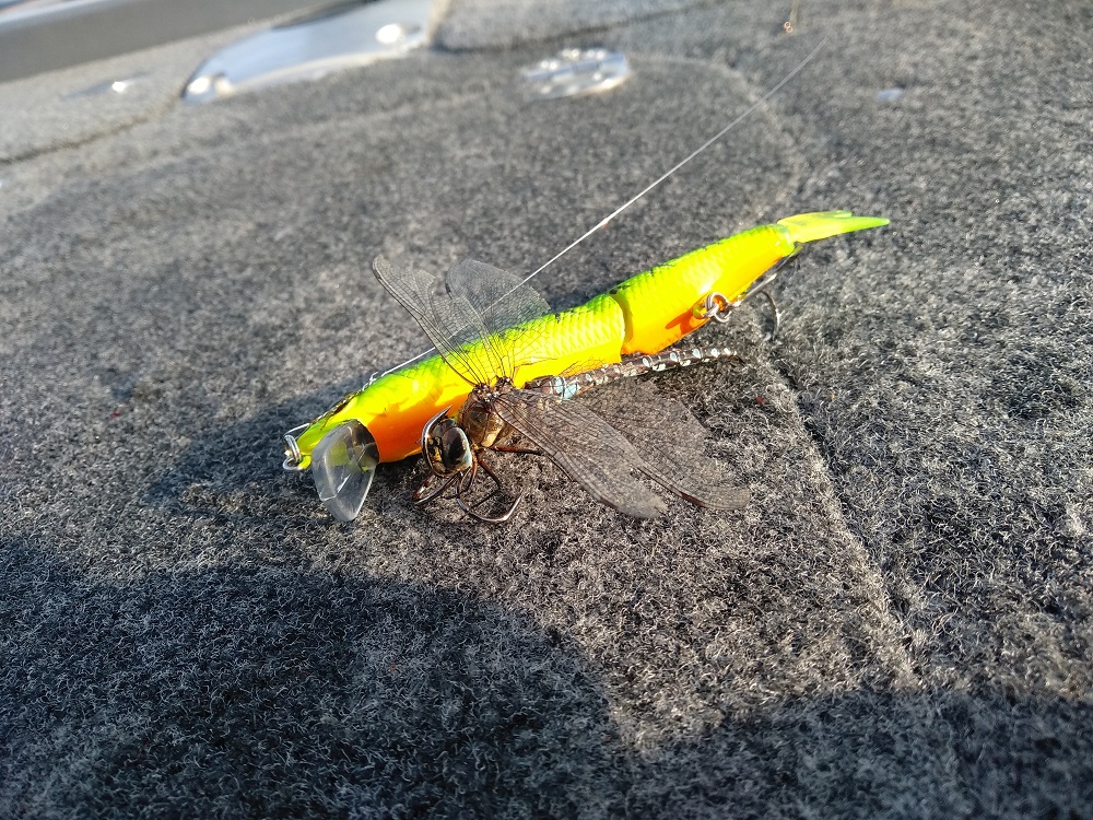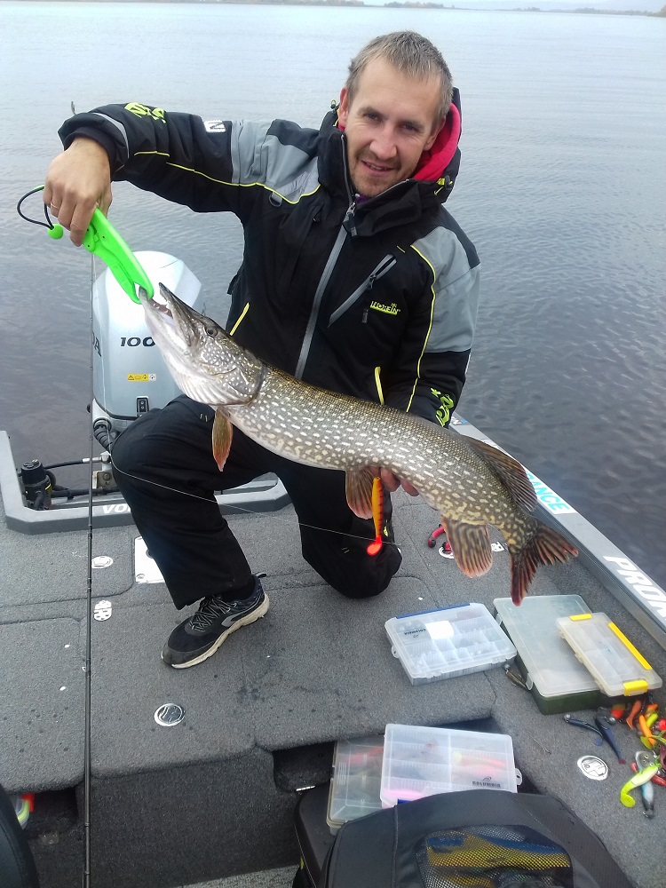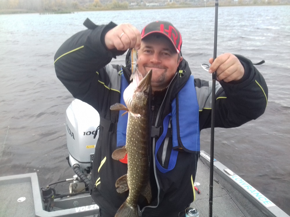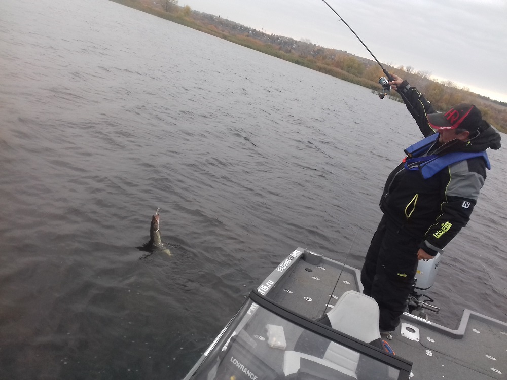 У нас 4 рыбы, надо закрываться. Николай ставить маленького DEPS 100F , за ним выходит щука, но не засеклась, я делаю туда быстрый заброс и она опять клюнула. Тащу, Коля не успевает вытащить свою приманку из воды, а положить удочку на борт запрещают правила PAL , потому как это будет пассивная ловля. Щука в итоге сходит, перекусив леску с волшебным Магалоном. Я просто расстроен. Второго кислотного у меня нет, только натуральный остался. Остается 30 минут - решаем идти на финиш и сделать одну постановку. Пришли за 10 минут, есть 15 минут на ловлю . Я вяжу приманку мыльный BAT FTK SWAGER цвет: 130 105 мм и 20 грамм. Спрашиваю :"Куда кидать?" .Я все переживаю , что слили щуку около 3 кг. На второй ступеньке удар, секу и понимаю, что я «впоролся в стену». Рыба делает рывок, 20 метров лески сошло , снимается с «ипилота», начинаю качать. Кручу катушку, три оборота, четыре- рыба опять делает рывок и еще сходит шнур. Я затягиваю фрикцион на 3 щелчка, начинаю качать, рыба идет к нам уверенно. Я верю, что мы ее возьмем. Зачем я еще затянул на 4 щелчка я не понял . Рыба еще быстрей начинает всплывать. Вот я готов ее поднимать, но рыба делает последний рывок, фрикцион затянут, не срабатывает и обрыв. Это самая большая рыба, что была на моей памяти. Руки опустились идем на финиш . За минуту до конца финишируем. Финиш , чуть больше за 11 кг. достаточно нормальное место в 10 . Завтра поборемся.