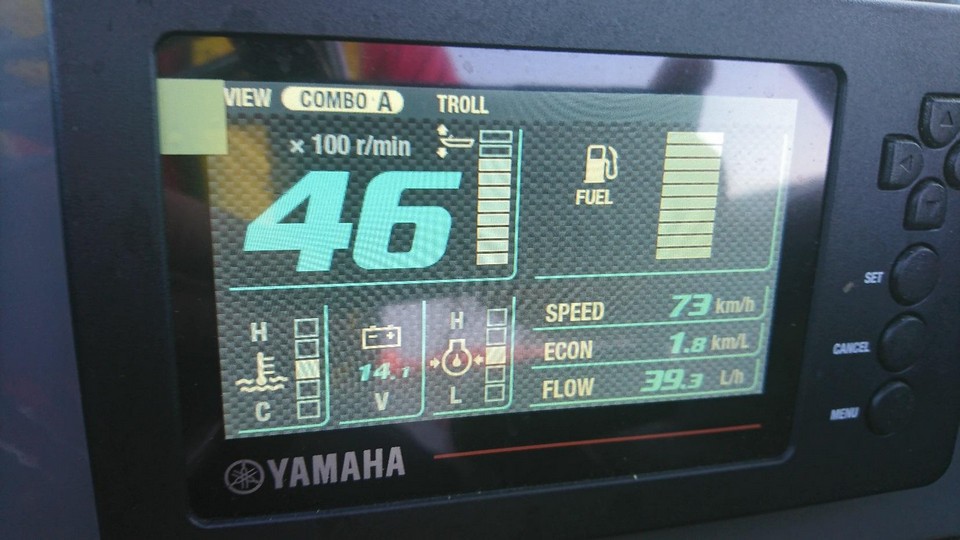 Эксплуатируя 175-ти сильную Ямаху, отметил, что ее характеристики- экономичность, простота обслуживания, надежность- достойны только восхищения. Ни одного отказа или сбоя в работе мотора (Тьфу-тьфу…). И это при том что, «кормим» мы мотор 92-м бензином… И не всегда это бензин с заправок «Лукойла» или Газпрома. Так иногда бывает, что судьба заносит нас соревноваться в глушь. Мотор действительно неприхотлив к качеству российского бензина. Пару слов про бортовой компьютер YAMAHA, который заменяет все приборы (тахометр, трим, датчик топлива, спидометр и т.д), позволяет выбирать оптимальные режимы движения, контролировать расход топлива, считает пройденное расстояние, показывает состояние зарядки аккумулятора и выдает еще много другой полезной информации. Удобно, информативно, и позволяет экономить деньги и время. К тому же, прибор не занимает много места на консоли.