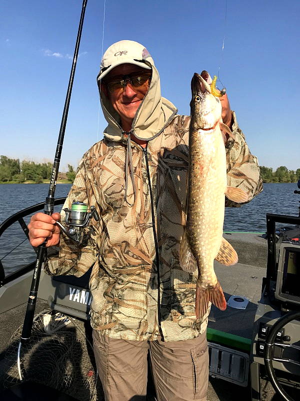 Немного передохнув, выходим на воду. Николай с Юрой пошли в верхнюю часть зоны, мы же с Алексеем решили «въехать в воду» на ближней акватории. Первая же бровка на границе с приличной семнадцатиметровой ямкой приносит поклевки не крупной, но очень бодрой щучки.